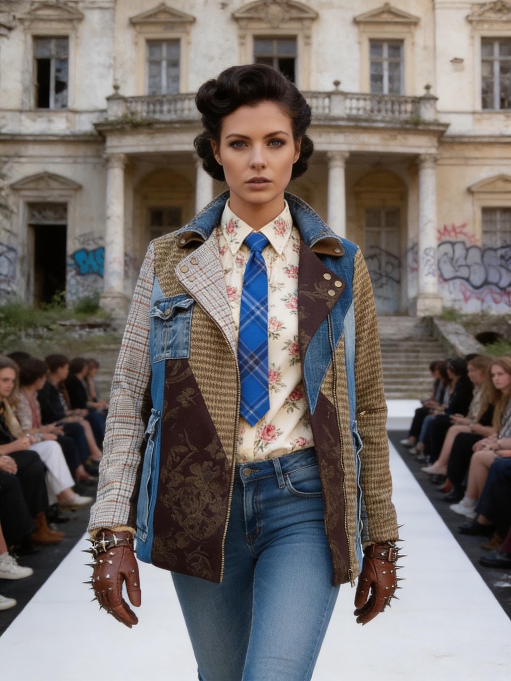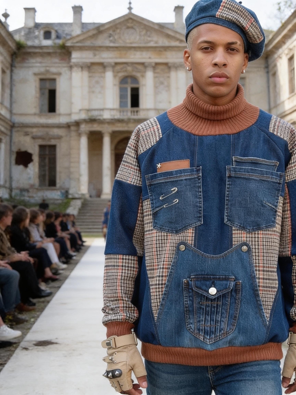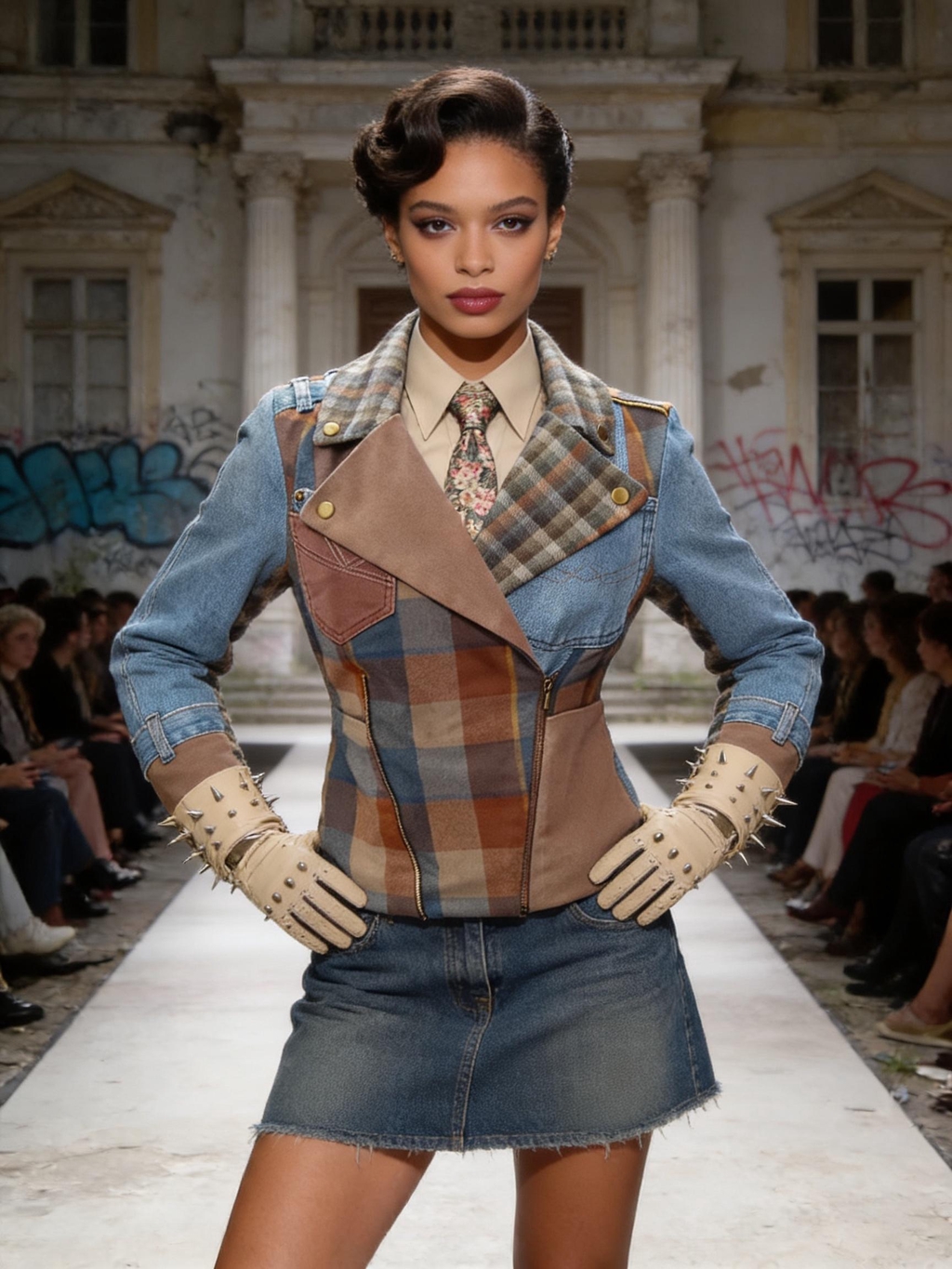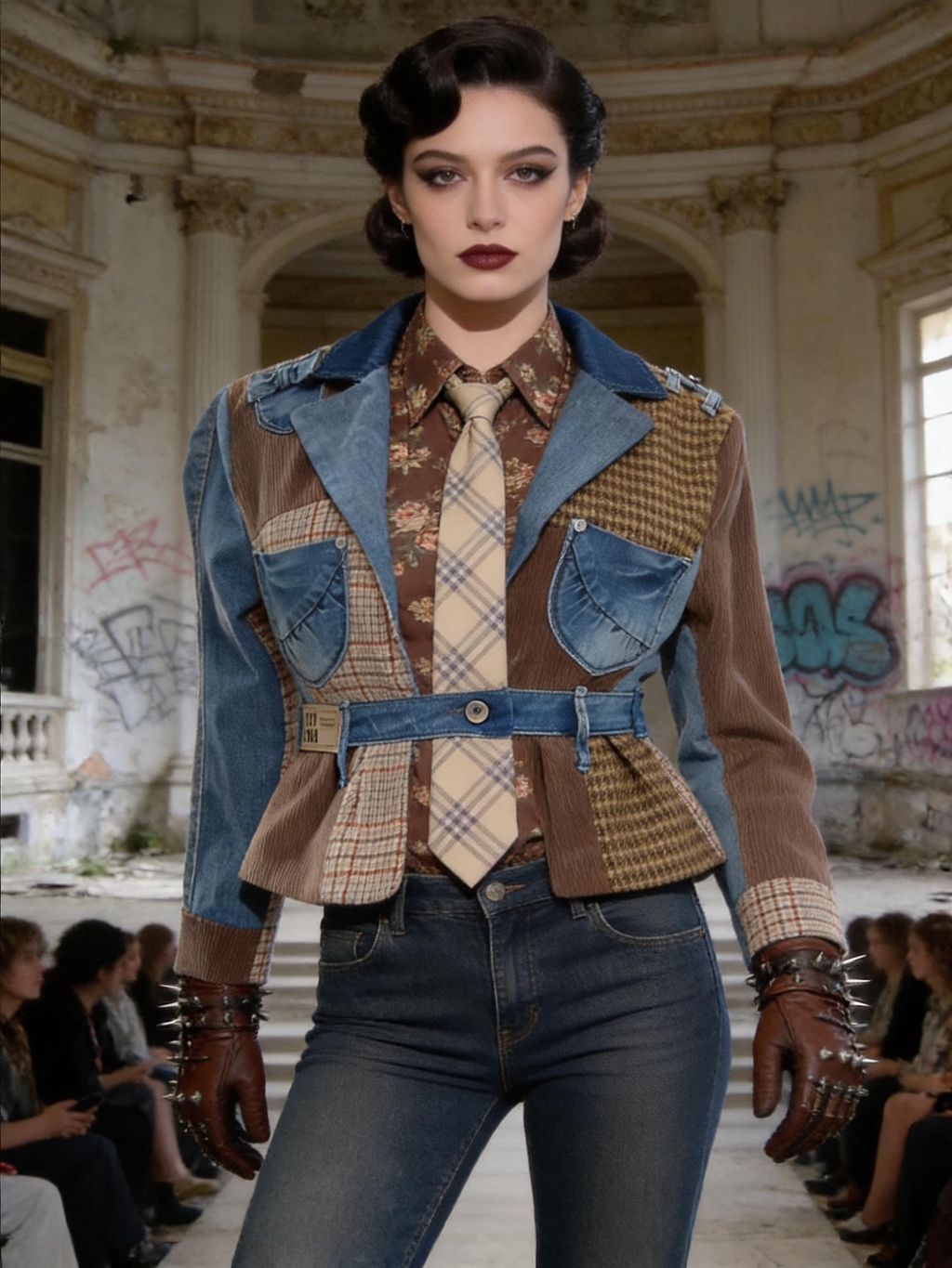 Giacche patchwork in denim e tweed, inserti in pelle, tartan destrutturati, borchie e dettagli cut-out ridisegnano i codici del punk in chiave contemporanea, valorizzando materiali recuperati e lavorazioni attente all’impatto ambientale. Ogni look è pensato per durare nel tempo: capi forti, identitari, da vivere e reinterpretare.