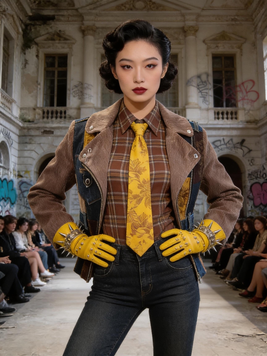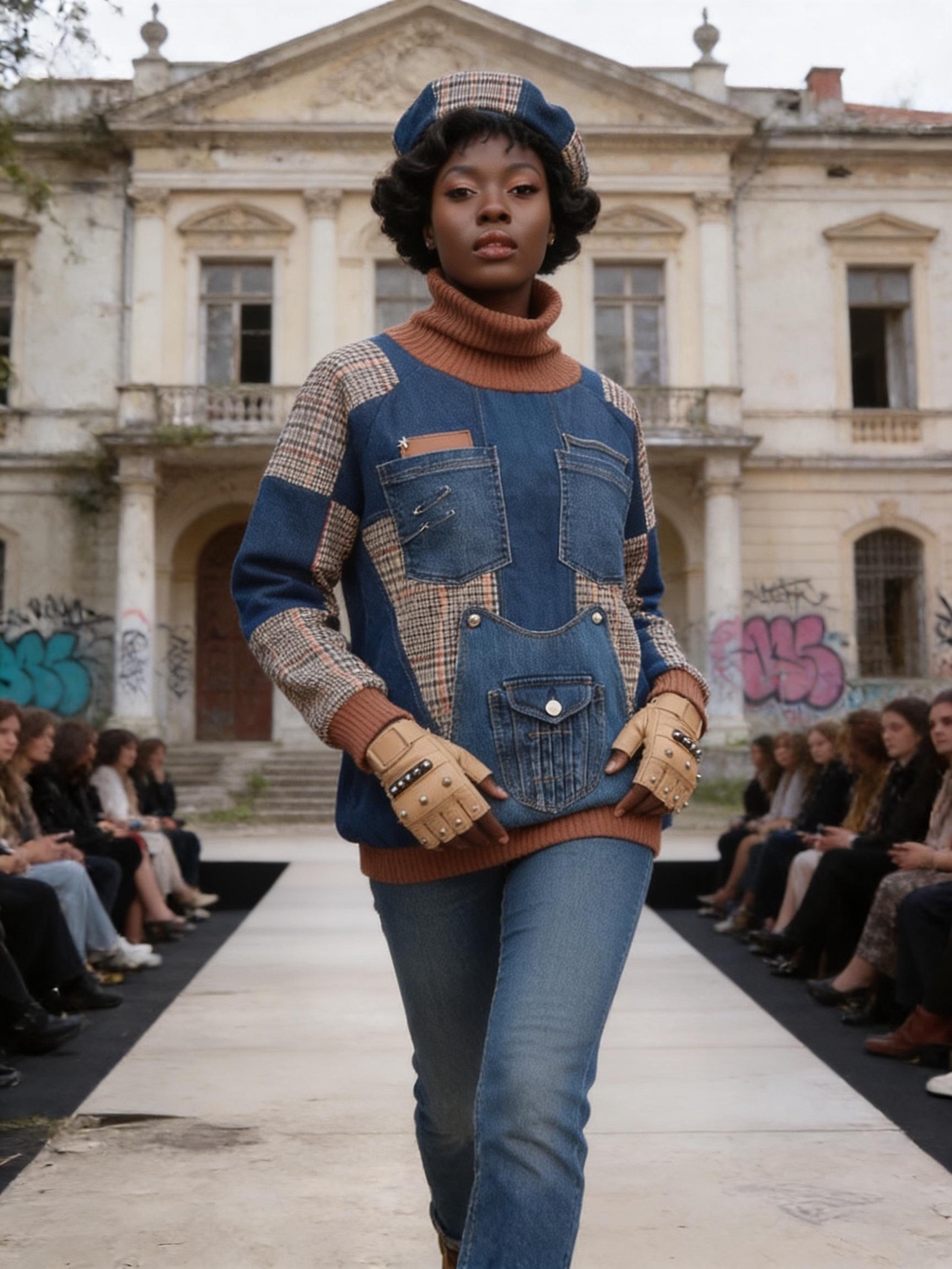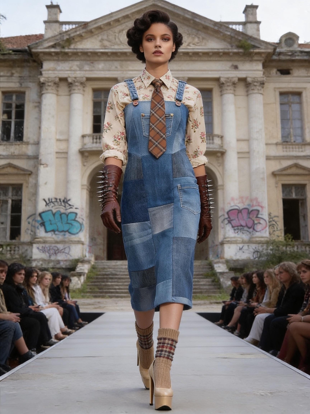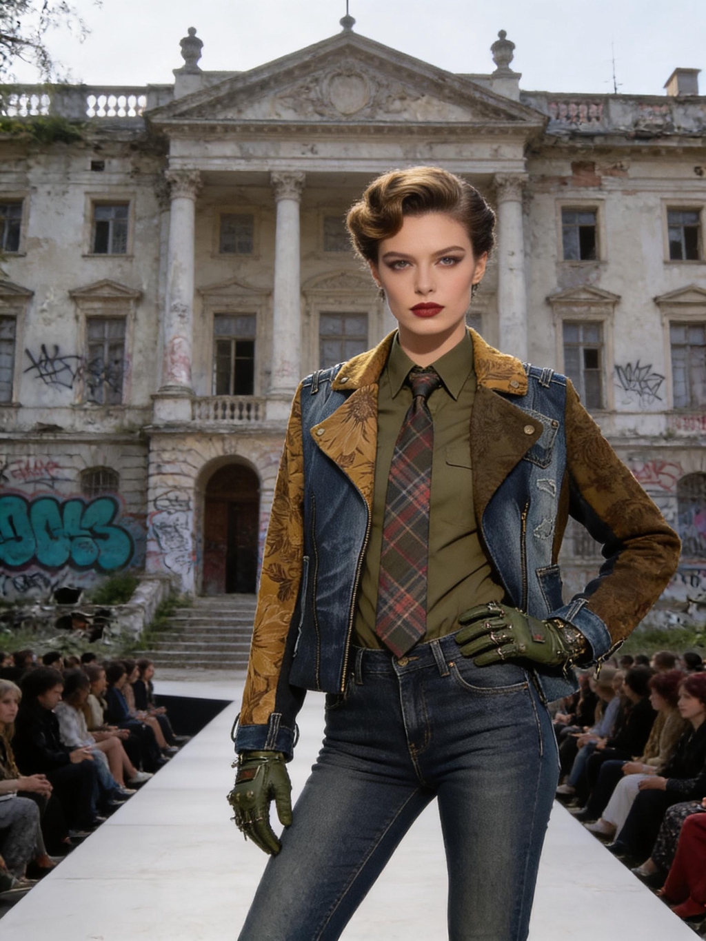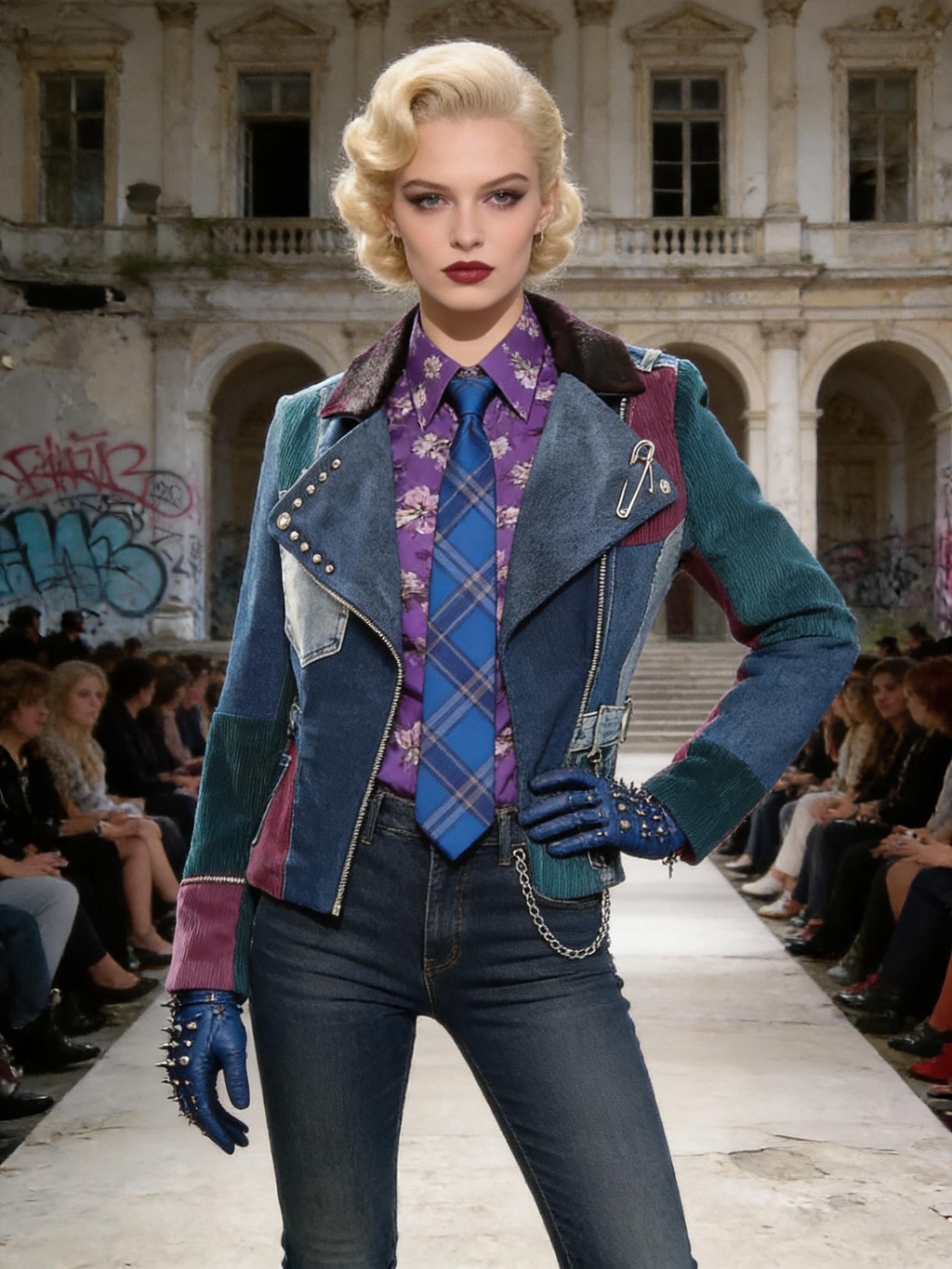 Giacche patchwork in denim e tweed, inserti in pelle, tartan destrutturati, borchie e dettagli cut-out ridisegnano i codici del punk in chiave contemporanea, valorizzando materiali recuperati e lavorazioni attente all’impatto ambientale. Ogni look è pensato per durare nel tempo: capi forti, identitari, da vivere e reinterpretare.