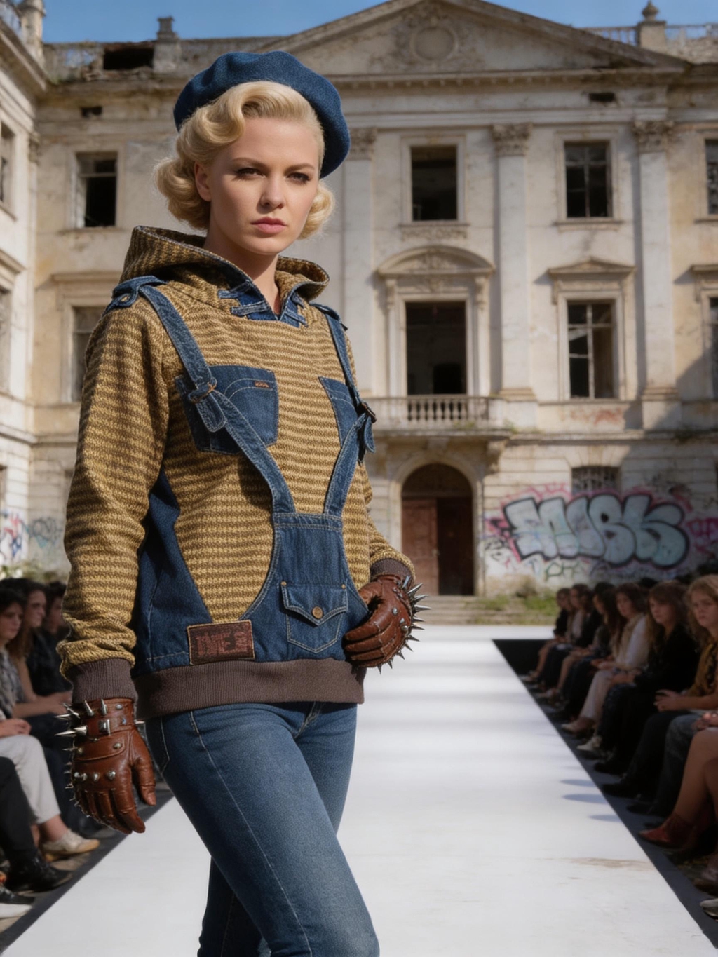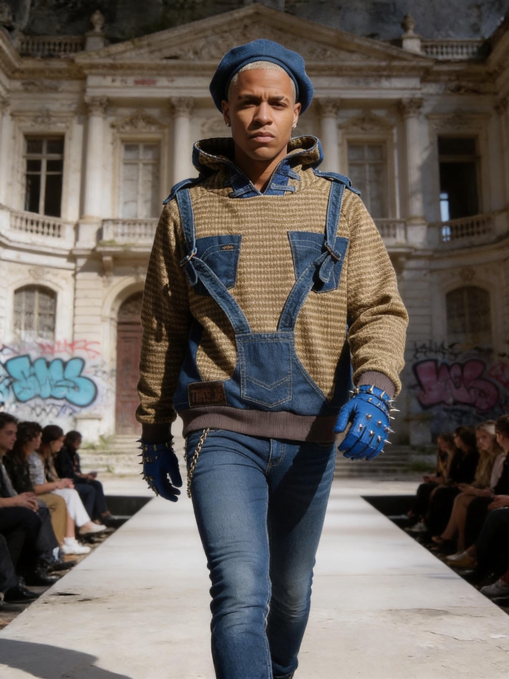 Marita Balàzs sceglie come scenografia un palazzo urbano decadente, ricoperto di graffiti, trasformandolo in una passerella a cielo aperto dove ogni passo racconta una nuova idea di moda sostenibile.