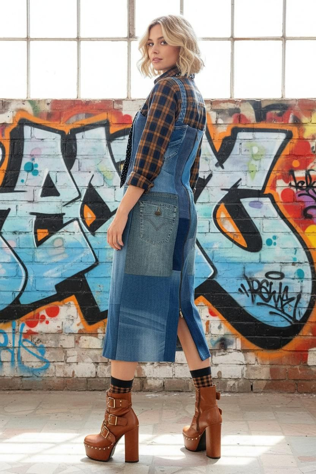 - Design e silhouette: abito salopette midi con cuciture a patchwork su pannelli di denim rigenerato; cerniera metallica posta retro per un effetto nascosto, con spalline regolabili per una vestibilità personalizzata.