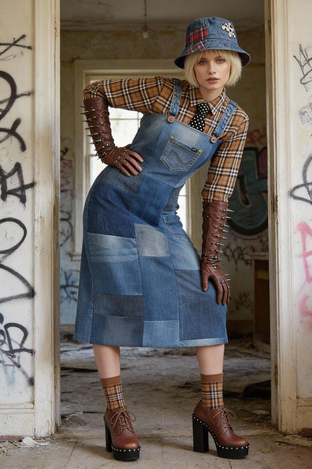 - Patchwork e texture: quadri di denim in diverse tonalità di blu, con una fodera maculata in viscosa che aggiunge profondità e un tocco retrò.