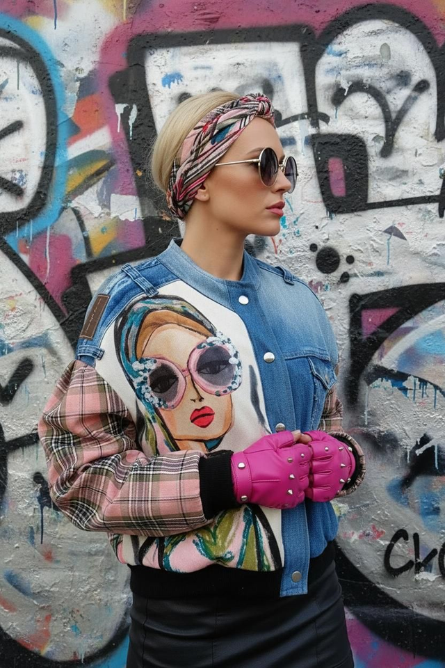 La giacca bomber in denim patchwork è un capo bold e femminile, perfetto per chi ama uno stile urbano con un tocco retrò. Unisce denim rigenerato, melange di tessuti a stampa e dettagli metallici per un look ready-to-wear che aggiunge carattere a qualsiasi outfit.