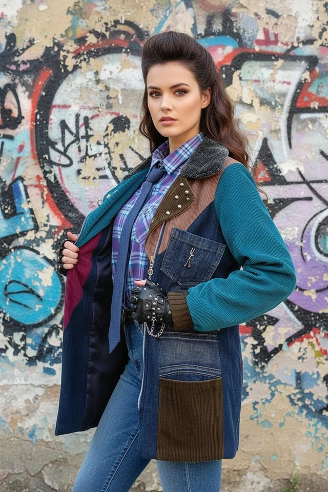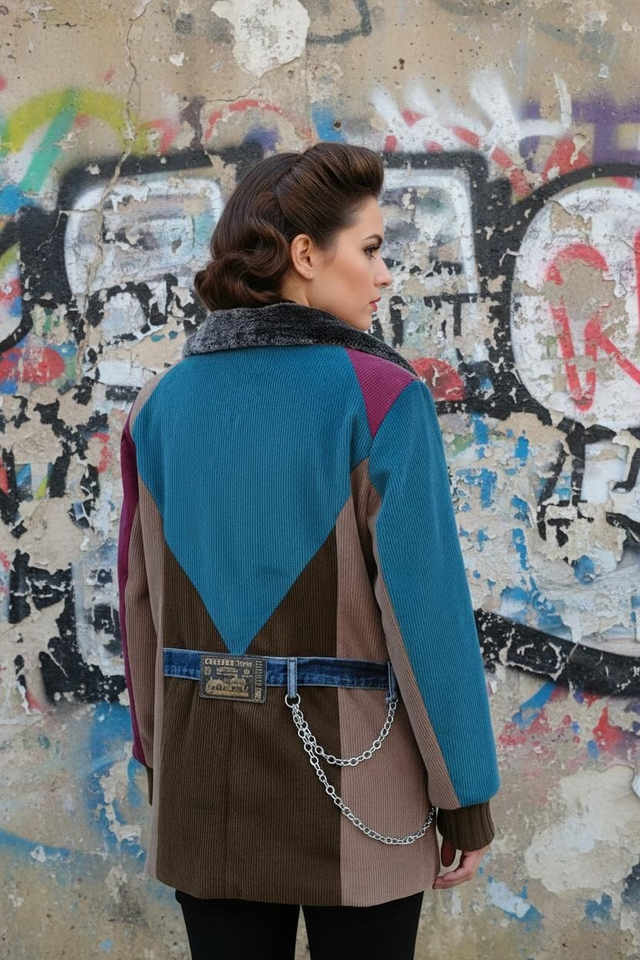- Patchwork e texture: pannelli di denim rigenerato in diverse tonalità (blu, turchese, marrone) mescolati con inserti in velluto, creando un effetto multistrato ricco di profondità.