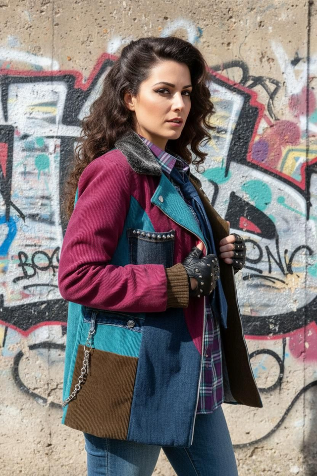 Il cappottino biker in denim rigenerato e velluto patchwork è un capo statement che mette al centro stile, comfort e sostenibilità. Ogni pezzo combina tessuti rigenerati con tocchi di velluto per un look audace e contemporaneo.