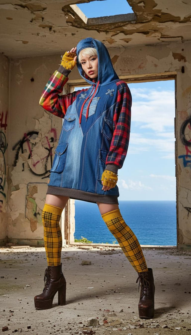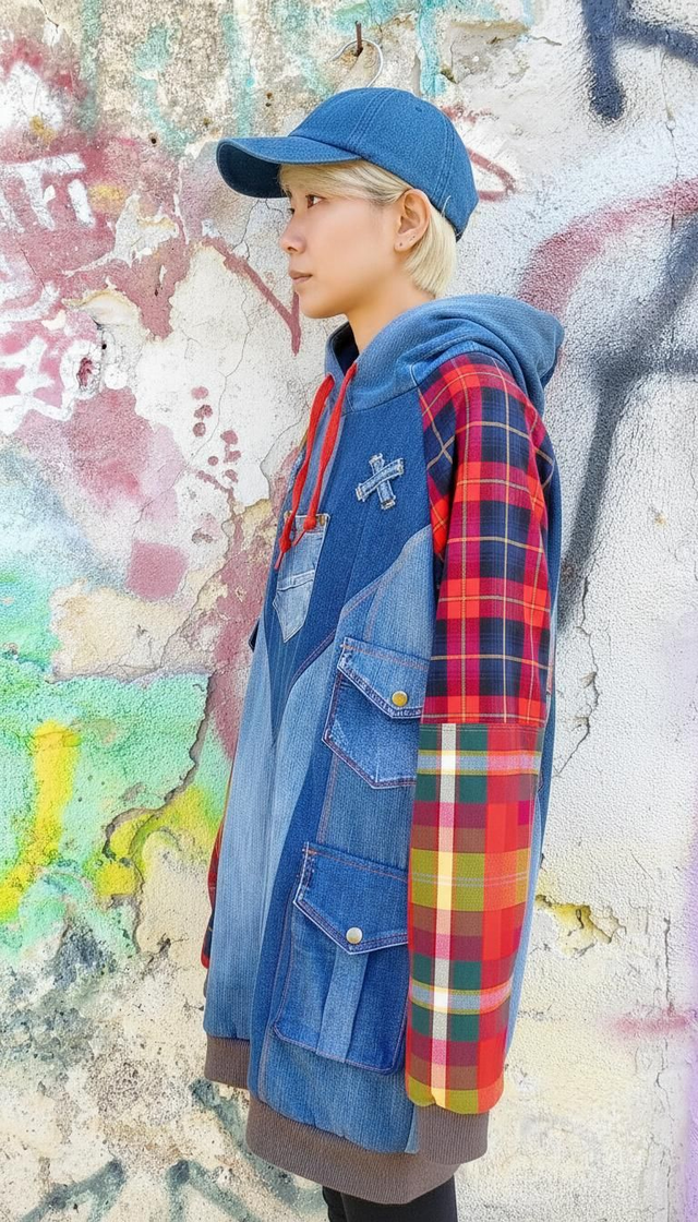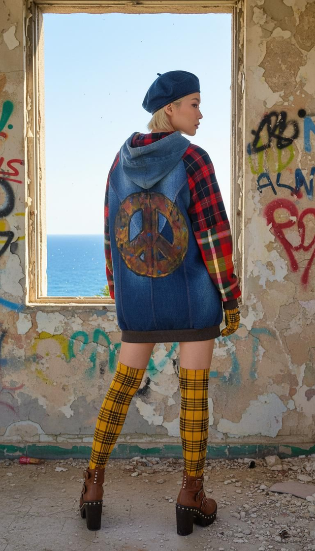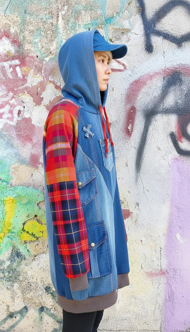 Felpa lunga unisex, realizzata in denim riciclato, con cappuccio e maniche in tartan misto cotone, lana e viscosa. Completamente foderata in tartan di viscosa e arricchita da pittura a mano, questa felpa è versatile e può essere indossata anche come vestito per le donne grazie alla sua lunghezza. Un pezzo unico che unisce sostenibilità e stile, perfetto per chi cerca un look audace e originale. Aggiungi un tocco di creatività al tuo guardaroba!