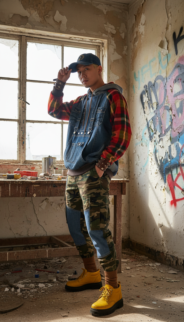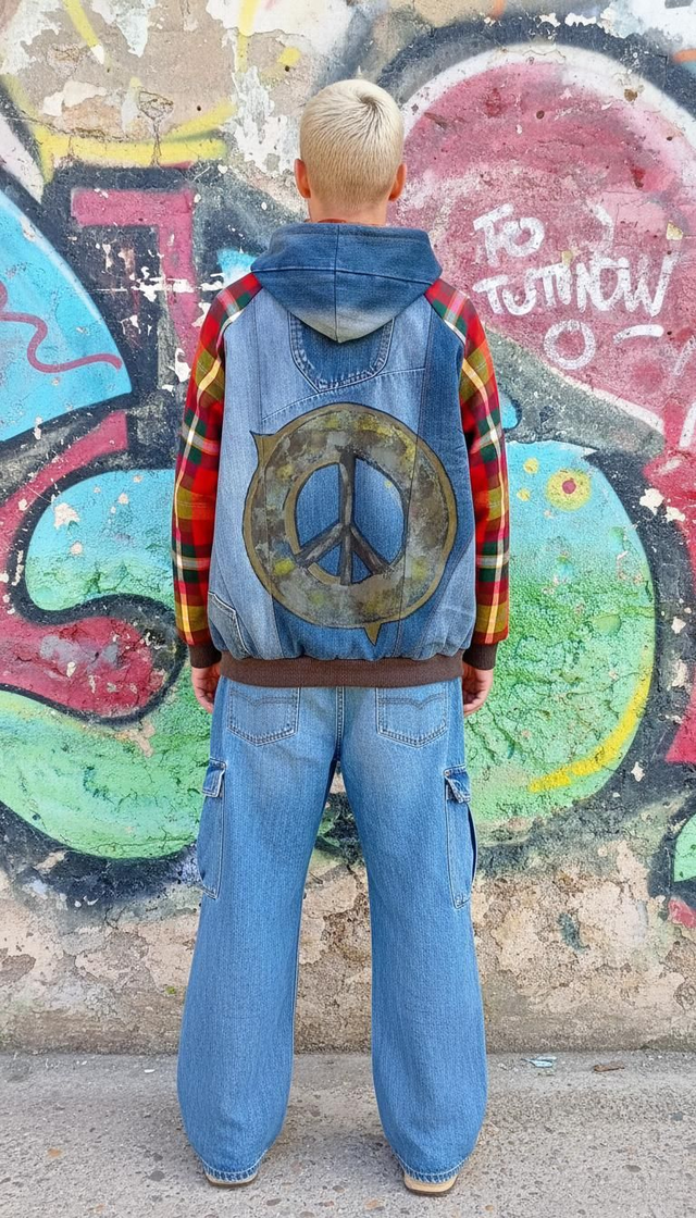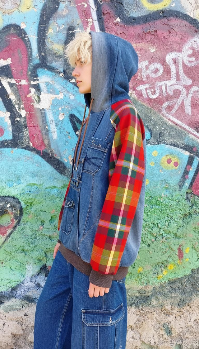 Felpa unisex in denim riciclato, realizzata da un paio di jeans a salopette. Questo pezzo unico presenta tasche a marsupio, un cappuccio foderato in tartan misto cotone, lana e viscosa, e maniche coordinate, anch'esse foderate in tartan in viscosa. I polsini in maglia di cotone e la pittura a mano aggiungono un tocco di originalità e creatività. Ideale per chi cerca uno stile audace e sostenibile, questa felpa è perfetta per arricchire il tuo guardaroba!