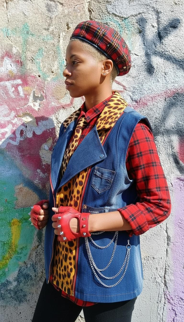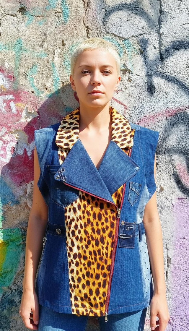 Aggiungi un tocco audace al tuo guardaroba con il nostro biker smanicato in denim rigenerato. Questo pezzo unico combina il classico denim con eleganti inserti in tessuto leopardato, creando un contrasto che cattura l'attenzione.