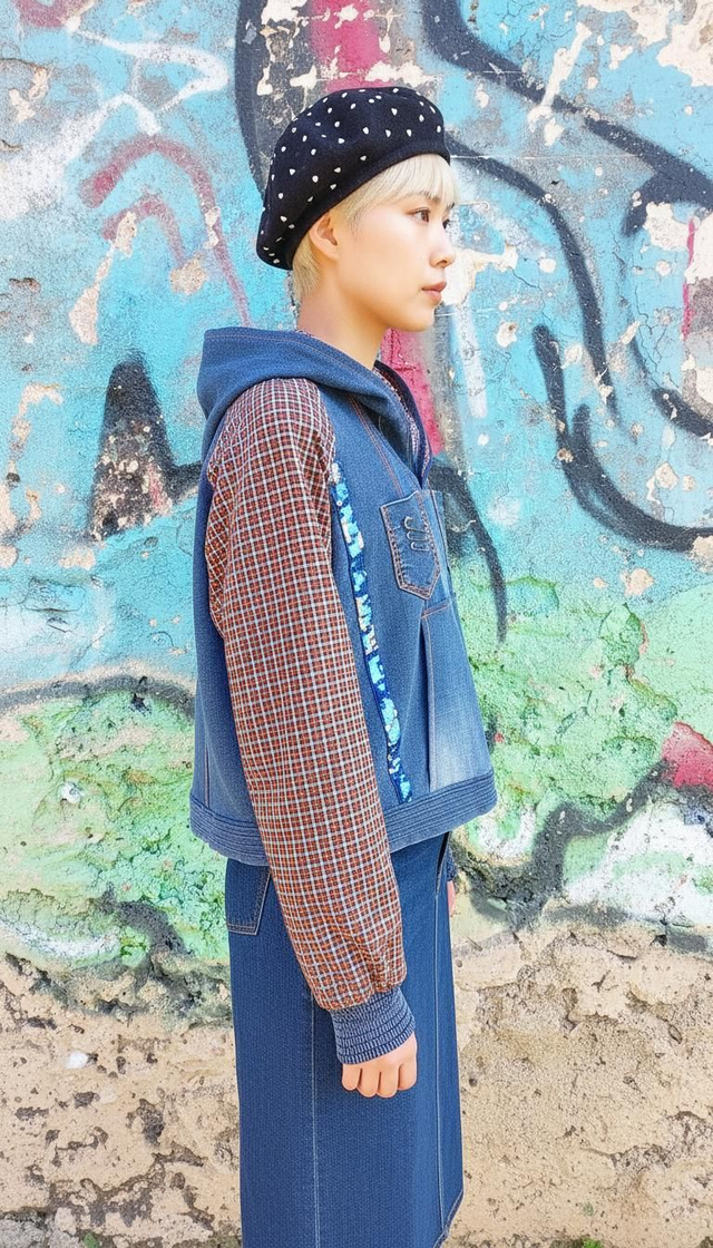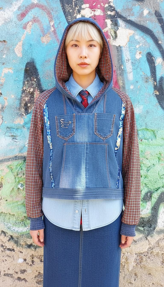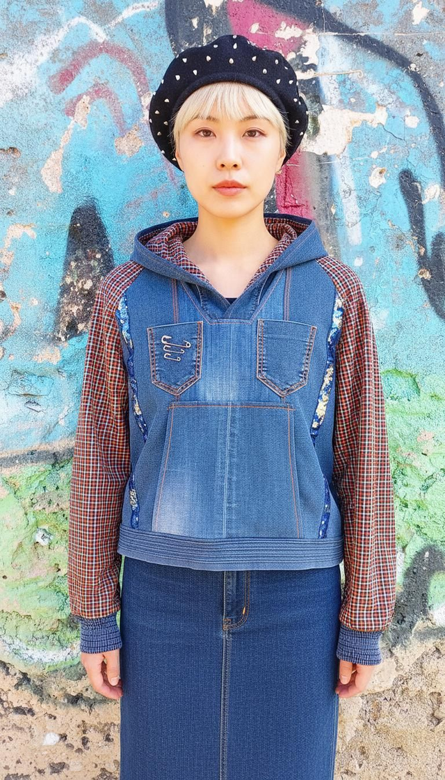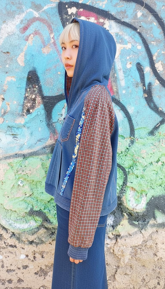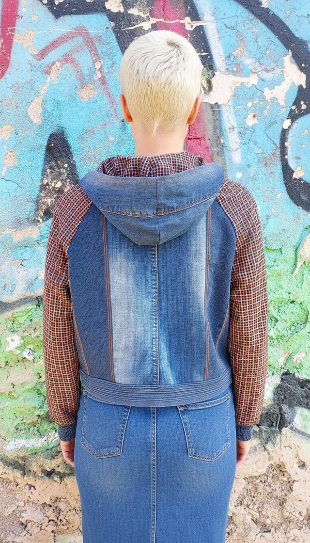 Felpa corta da donna, realizzata in denim riciclato con cappuccio e tasche a marsupio. Le maniche in tartan misto cotone e viscosa aggiungono un tocco di originalità e comfort. Completata da polsini e margine inferiore sempre in denim riciclato, questa felpa è perfetta per chi cerca uno stile casual e sostenibile. Un pezzo unico ideale per arricchire il tuo guardaroba con creatività!
